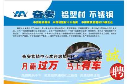 福建奮安集團(tuán)成立于1988年,是一家專業(yè)生產(chǎn)鋁合金型材、不銹鋼管材、門窗幕墻配件、密封膠的大型綜合性現(xiàn)代化企業(yè),位列“中國(guó)建筑鋁型材二十強(qiáng)企業(yè)”,獲得“中國(guó)馳名商標(biāo)”“中國(guó)十大鋁型材品牌”榮譽(yù)稱號(hào),被評(píng)為“最具創(chuàng)新與價(jià)值企業(yè)”。集團(tuán)總占地面積2000多畝,共擁有4個(gè)生產(chǎn)基地(福建福清奮安鋁業(yè)科技工業(yè)城、河南焦作奮安鋁業(yè)工業(yè)城、福建奮安不銹鋼生產(chǎn)基地、不銹鋼閩侯生產(chǎn)基地),可年產(chǎn)鋁型材30萬(wàn)噸、不銹鋼管5萬(wàn)噸,年產(chǎn)值可達(dá)50多億元。