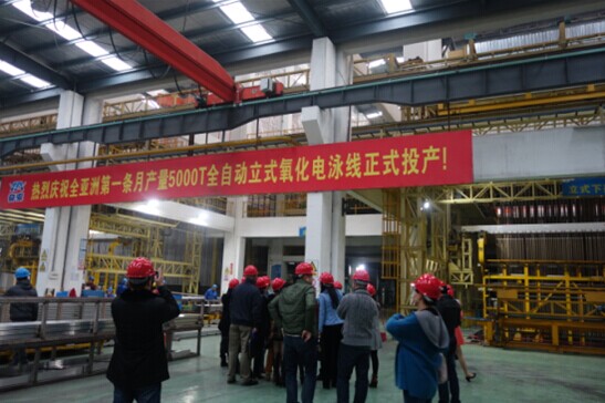 我司營銷總監(jiān)黃磊和生產(chǎn)副總歐開干正為貴賓介紹我司全亞洲第一條月產(chǎn)量5000T自動立式氧化電泳生產(chǎn)線