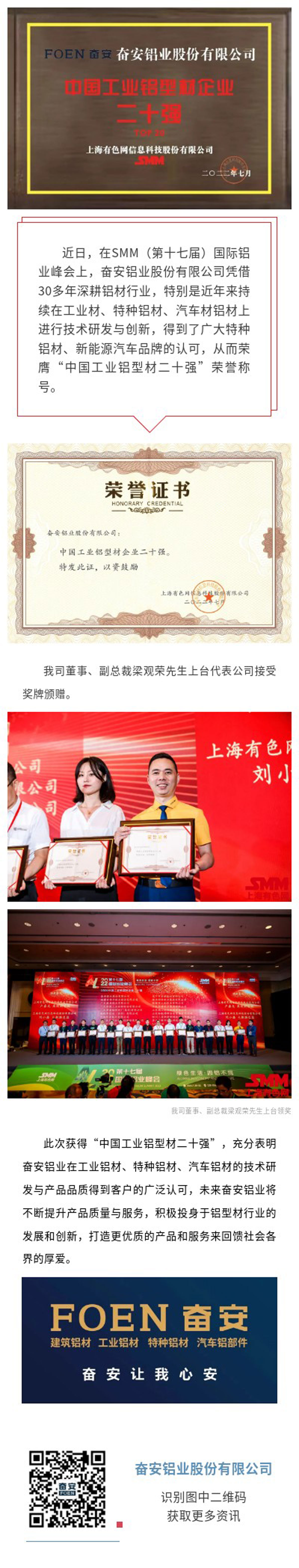 喜訊 | 奮安鋁業(yè)榮膺中國工業(yè)鋁型材企業(yè)二十強(qiáng)