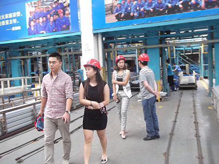 林秘書仔細(xì)地向各位貴賓介紹我司福清科技工業(yè)城的各個生產(chǎn)車間及各道生產(chǎn)工序,尤其是在噴涂和氧化車間時,貴賓對型材的表面處理工藝考察得特別仔細(xì)。林秘書介紹道,我司目前擁有四條立式噴涂線,此外,在即將竣工的二期工程,還擁有全亞洲第一條月產(chǎn)量達(dá)5000噸的立式氧化線。