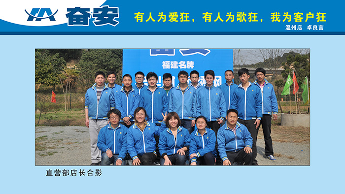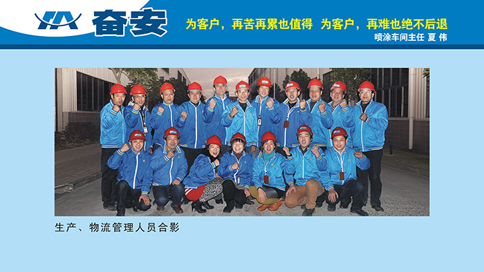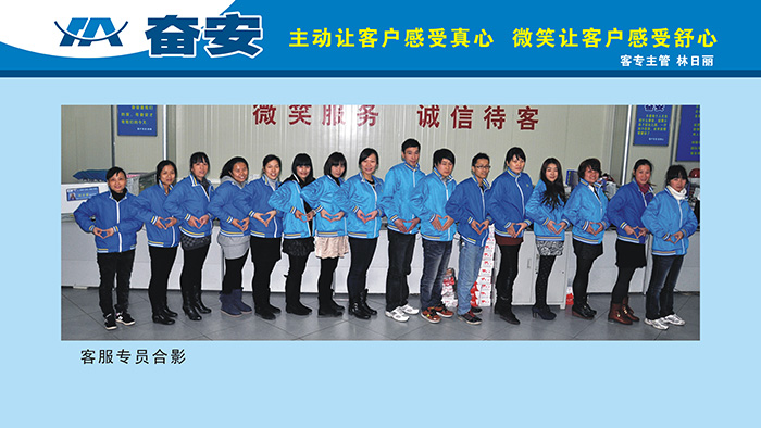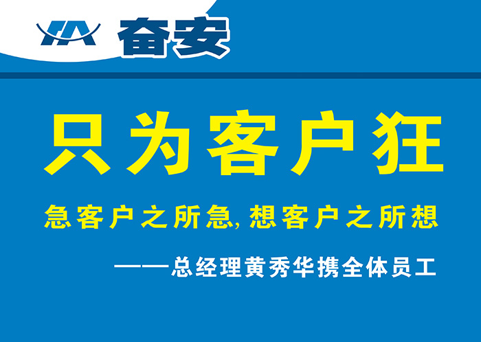 一部由奮安集團(tuán)市場(chǎng)中心主辦的,匯集奮安集團(tuán)銷(xiāo)售、生產(chǎn)、后勤、物流各職能部門(mén)職員,在奮安1號(hào)客服——集團(tuán)總經(jīng)理黃秀華女士的帶領(lǐng)下,秉承“只為客戶狂——盡一切努力,只為客戶滿意”的服務(wù)理念,在日常工作中所表現(xiàn)出來(lái)的各種狂人狂事的著作《只為客戶狂》,于2014年2月11日正式出版。 奮安人全員皆客服,全體奮安人只為客戶而瘋狂,做客戶真誠(chéng)的朋友和伙伴。為感謝廣大客戶對(duì)奮安的支持與鼓勵(lì),奮安全體成員將更加用心做得更好來(lái)回報(bào)客戶,我們將嚴(yán)格按照“品質(zhì)高、交期準(zhǔn)、服務(wù)好”的標(biāo)準(zhǔn)來(lái)為客戶創(chuàng)造最大的價(jià)值。這就是我們只為客戶而瘋狂的奮安人。 (只為客戶狂)