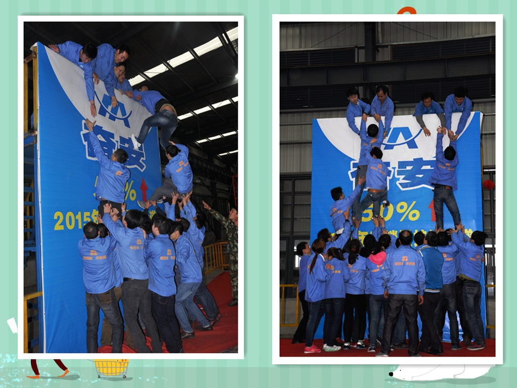 下午,各個部門、車間的“產(chǎn)銷量遞增50%以上”任務(wù)墻的挑戰(zhàn)賽更是將游園活動推向了高潮。每個部門、車間成員團結(jié)一心,全力合作翻越挑戰(zhàn)墻的場景不僅預(yù)示著奮安人在新的一年將信心百倍的去完成產(chǎn)銷量遞增50%以上的目標(biāo),更體現(xiàn)了奮安家人團結(jié)一致克服困難的精神。
