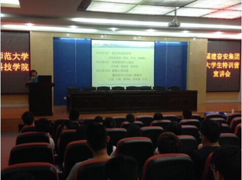 6月11日下午,奮安集團一行四人前往福建師范大學(xué)閩南科技學(xué)院進行現(xiàn)場招聘,為奮安商學(xué)院閩科院經(jīng)管系大三應(yīng)屆畢業(yè)生開設(shè)大學(xué)生特訓(xùn)營做準(zhǔn)備。在該學(xué)院邱院長、經(jīng)管系陳主任、劉主任和校企合作辦劉主任的大力支持下,于下午14:30在學(xué)校圖書館一樓會議室舉辦了現(xiàn)場招聘會,此次前來參加招聘會的學(xué)生超過100人。奮安集團人資總監(jiān)陳凌芹女士詳細向大家介紹了我司的企業(yè)發(fā)展?fàn)顩r,現(xiàn)場互動頻頻,氣氛融洽。